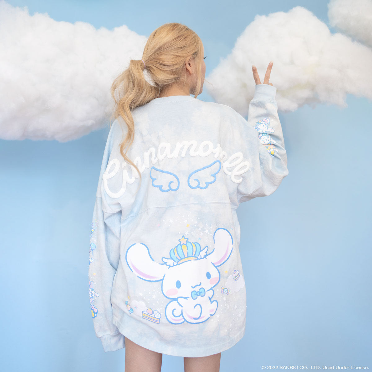 This Cinnamoroll Anniversary JapanLA Spirit Jersey features a blue and white cloud tie dye unisex Spirit Jersey top with puff printing of Cinnamoroll on the front. On the upper back, Cinnamoroll’s name is printed using white super puff with cute blue wings underneath. On the lower back is a large graphic of Cinnamoroll with sparkly glitter clouds and sweet treats! The right sleeve features Lala, Pompompurin, Pochacco, and Hello Kitty wearing the cutest Cinnamoroll themed outfits. The JapanLA Logo is printed on the left sleeve along with Kiki, Kuromi, and My Melody dressed up in their cute Cinnamoroll themed outfits.