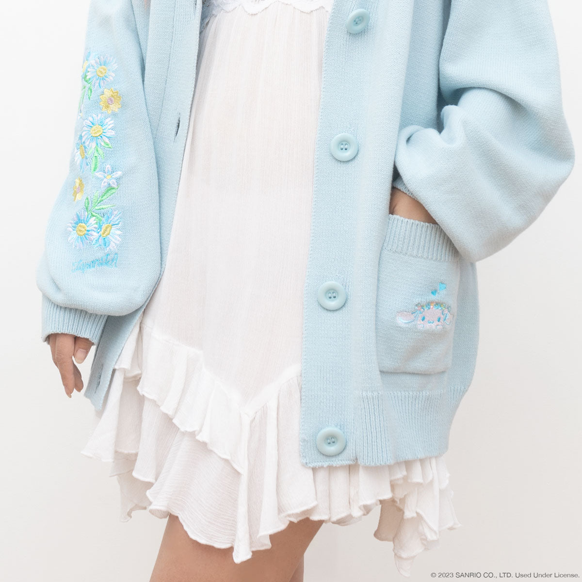 This JapanLA Cinnamoroll Floral Cardigan is made from fully-knitted light blue cotton fabric! The front of the cardigan features two pockets with an embroidered Cinnamoroll graphic on the left side. The back of the cardigan has a full-sized embroidered design with Cinnamoroll surrounded by flowers and ribbons.