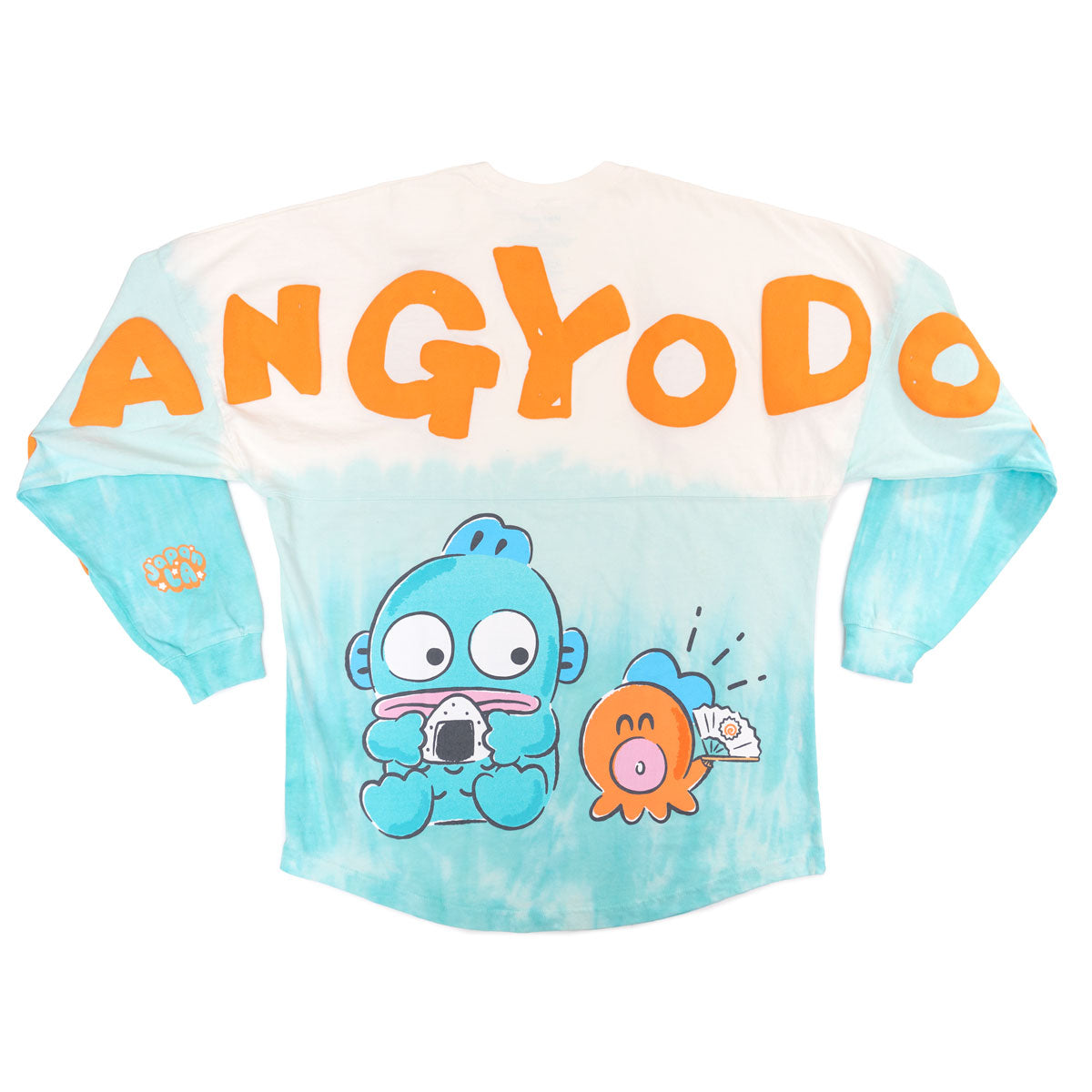 This Hangyodon Spirit Jersey features an aqua and white dip-dye top with Hangodon and his octopus friend Sayuri on the front. On the upper back, Hangyodon is printed across the shoulders and arms using orange super puff. On the lower back is a large graphic of Hangyodon holding a rice ball and Sayuri holding a cute fan. The JapanLA Logo is printed on the left sleeve.